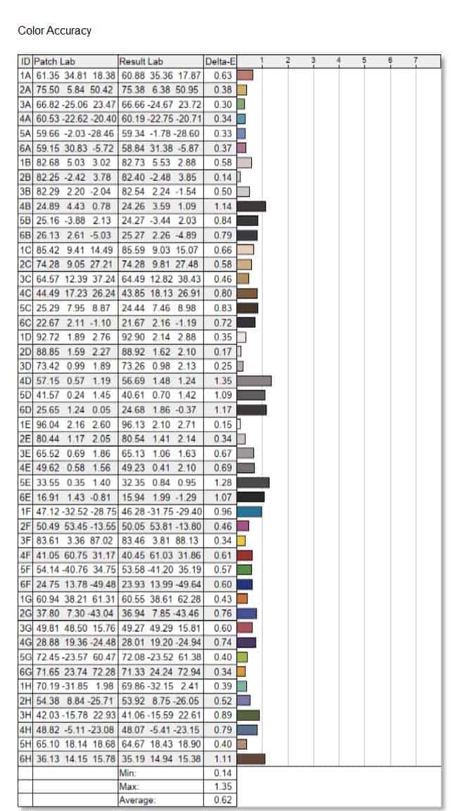 Valorile pentru deviația culorii ( deltaE ) confirma din nou ca este un monitor extraordinar. 1.35 valoare maxima este wow, iar valoarea medie de 0.62 este o valoare peste așteptări. Ca referinta orice monitor măsurat cu valoare medie deltaE de sub 2.00 este bun pentru editare. Eizo este de 3 ori sub aceasta limita.