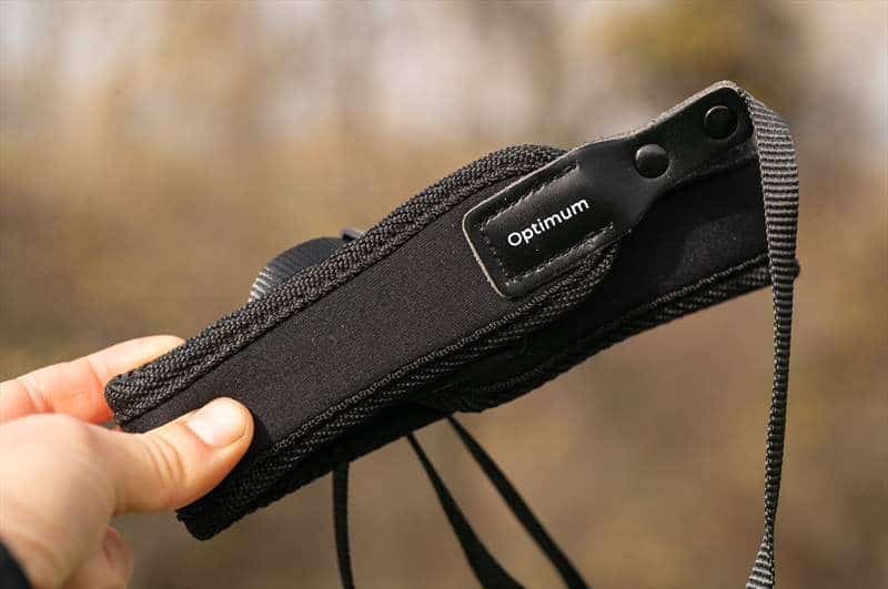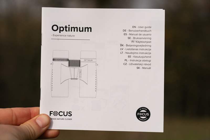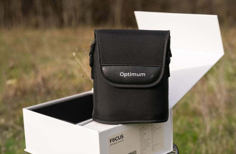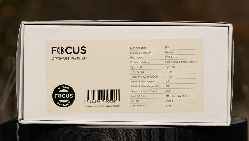 Focus Optimum 10×42 ED este un binoclu compact de ~660 grame care are o constructie solida si o ”armura” din cauciuc de 2 mm care protejează optica si carcasa de șocuri mecanice. Se simte solid in mana, roata de ajustare de focus este metalică, la fel si legaturile intre cei doi cilindri optici. Inelul de ajustare pentru dioptrii este din plastic si la fel este si capacul prinderii de trepied a binoclului. Mișcarea ocularelor, rotitei de compensare pentru dioptrii este fina si calitatea acestui model se vede in fiecare interacțiune cu părțile mecanice.