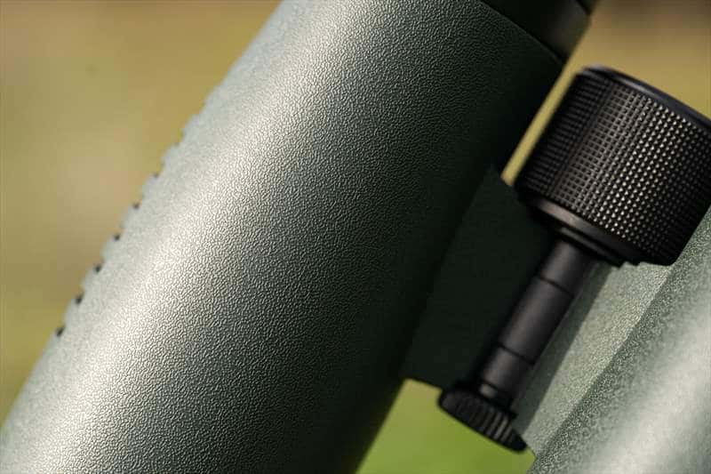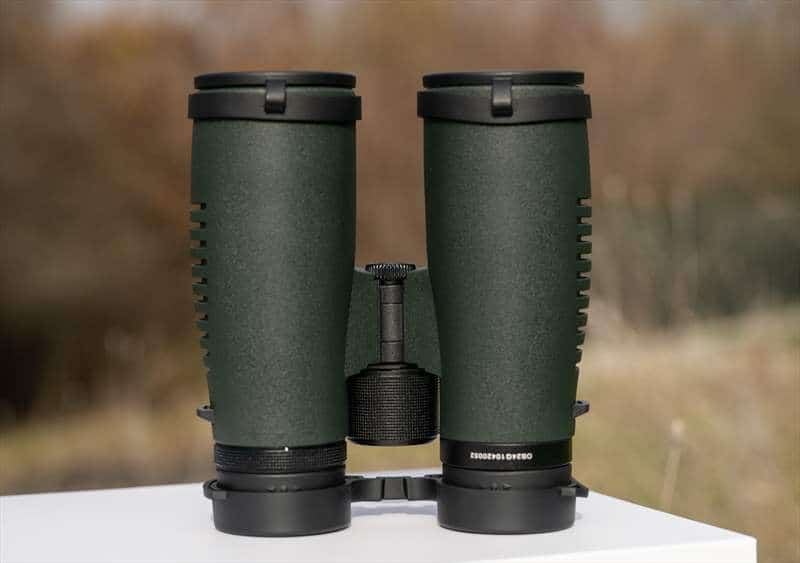 Cam așa se vede Focus Optimum 10×42 ED din fata. Armura verde acoperă corpul, are o textura plăcută si ergonomie buna.