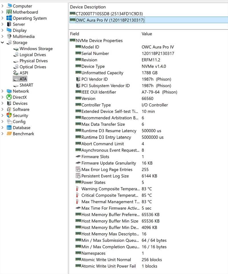Toate detaliile tehnice afisate de AIDA64 Engineer despre SSD-ul Envoy Ultra.