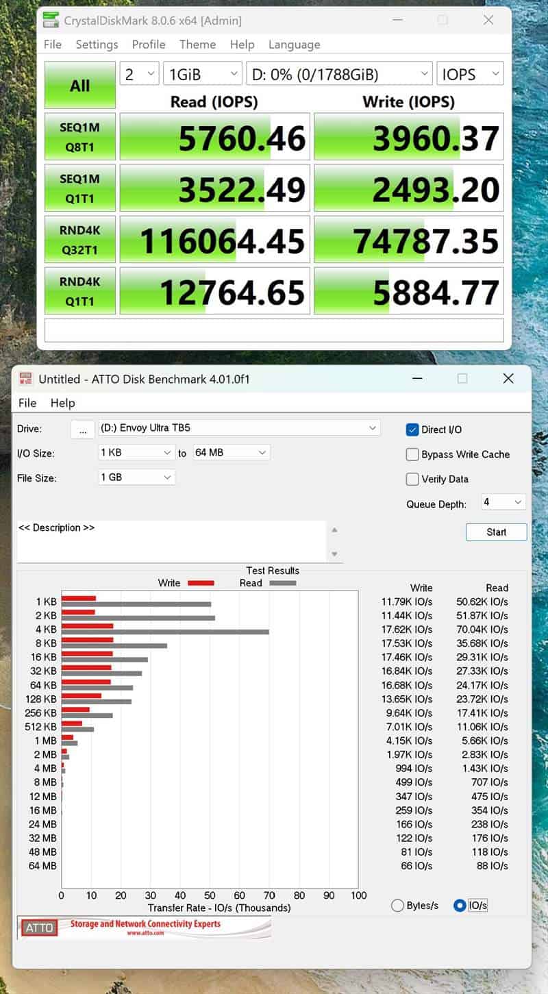 Performantele de citire sar de ~5500 MB/s in timp ce scrierile sunt putin peste ~3800 MB/s in ATTO. In CrystalDisk stau ceva mai bine.