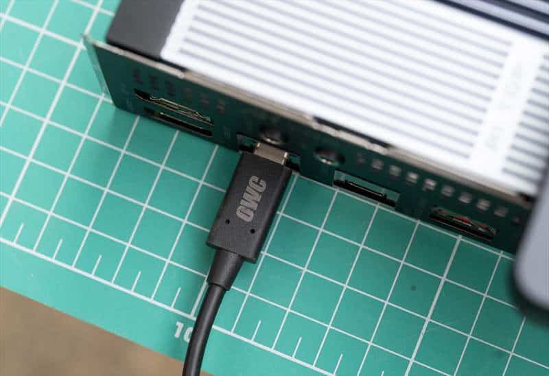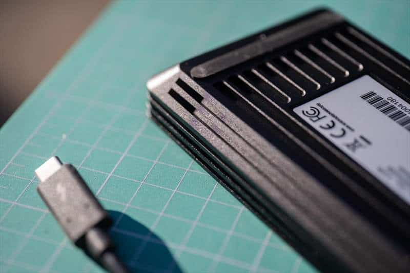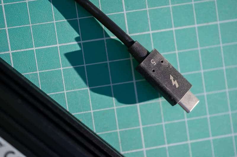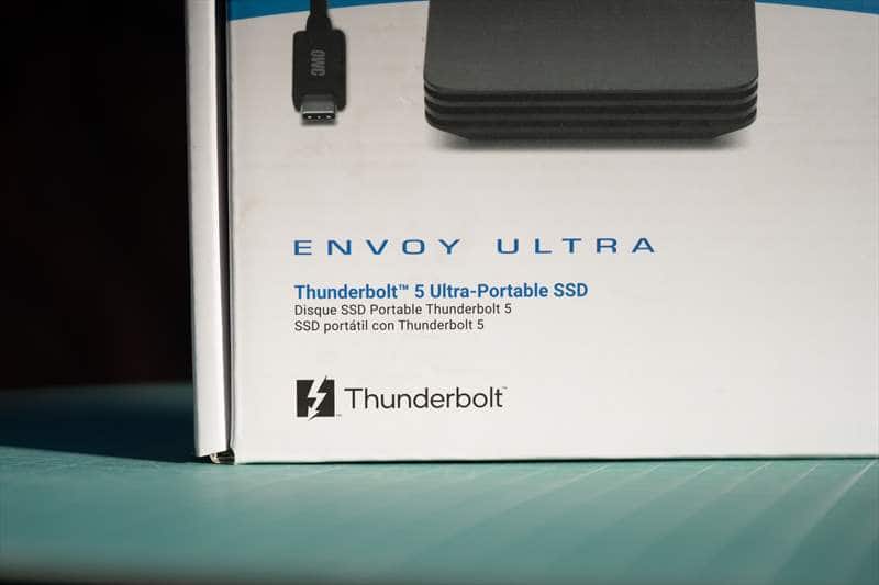 Cam asa se prezinta cablul Thunderbolt 5 si partea inferioara a SSD-ului.