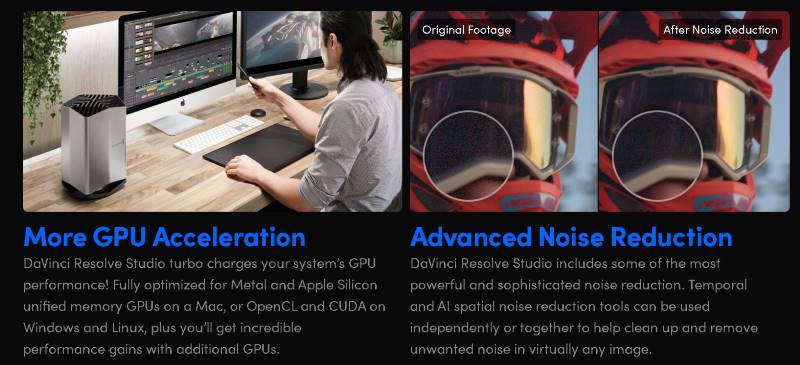 Functionalitatile avansate cu AI din editia oficiala DaVinci Resolve 20 includ o suita avansata de unelte AI cu ajutorul placilor GeForce RTX. Nucleele NVIDIA TensorRT optimizeaza performantele AI. Una din instantele care beneficiaza de aceasta putere AI este UltraNR Noise Reduction. O unealta cu AI care tinteste inteligent zgomotul digital pentru a-l reduce fara sa faca imaginea soft. Se pare ca pe noua placa GeForce 5090, UltraNR Noise Reduction AI ruleaza cu 75% mai repede fata de generatia anterioara.