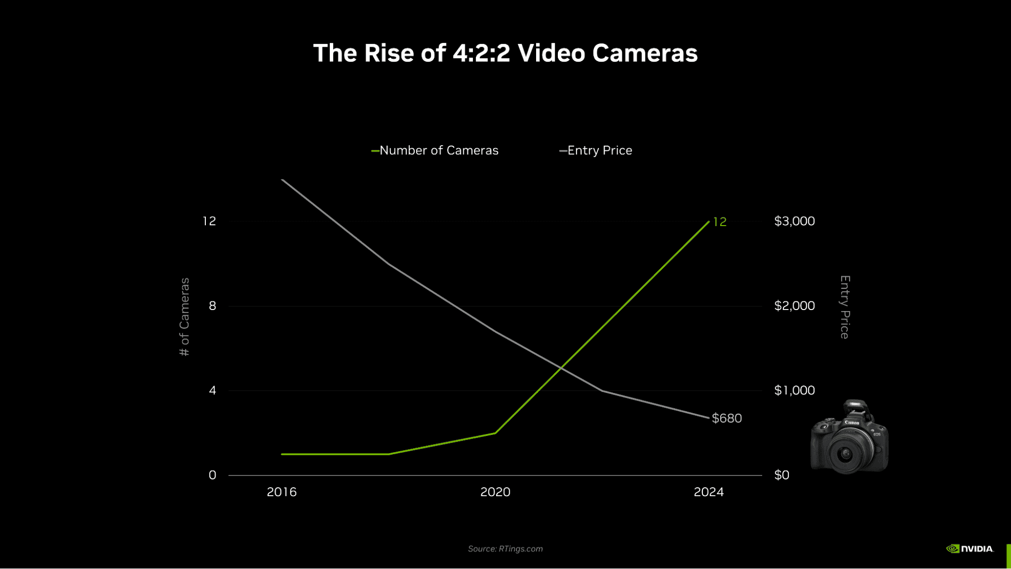 Camerele care filmeaza in format 4:2:2 exista de ceva vreme, prima a fost Panasonic GH5 acum cativa ani. De atunci pana acum, Sony, Fujifilm, Panasonic, Canon si Nikon sunt de ceva vreme capabile de inregistrarea video in acest format cu fidelitate marita. Totusi pe partea de hardware de procesare se putea randa exclusiv cu seria de placi video Nvidia A-Series ( sau fostele Nvidia Quadro ). Numai ele aveau encoder NVEC, dar se pare ca seria Nvidia RTX 50 deschide calea si consumatorilor. O miscare foarte buna pentru segmentul de productivitate.