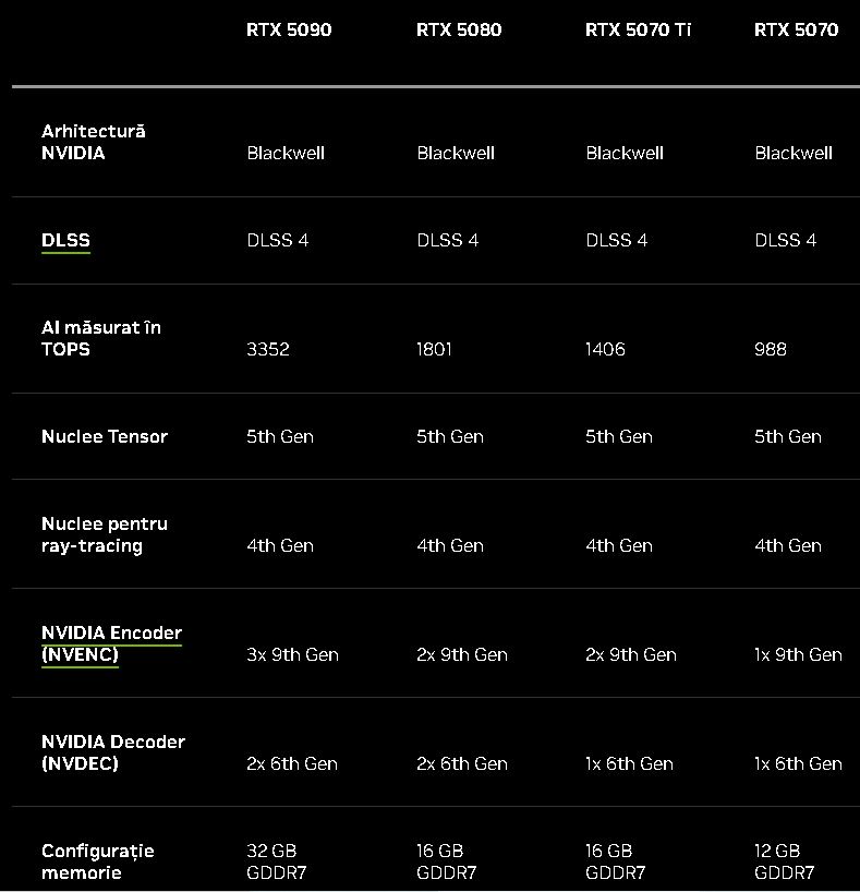 Si cum viteza nu este totul, fidelitatea culorilor si precizia oferita de standardul 4:2:2 este bine-venita. Daca alegi NVIDIA GeForce RTX 5070 Ti, RTX 5080 sau RTX 5090 ai 2 Encodere NVEC, respectiv 3 pentru 5090. Pentru restul seriei RTX 50 ai disponibil 1 Encoder si un Decoder NVEC. Viitorul suna bina, iar daca implementarile cu AI vor tinti si partea de render/export va fi cu atat mai usor pentru editori.