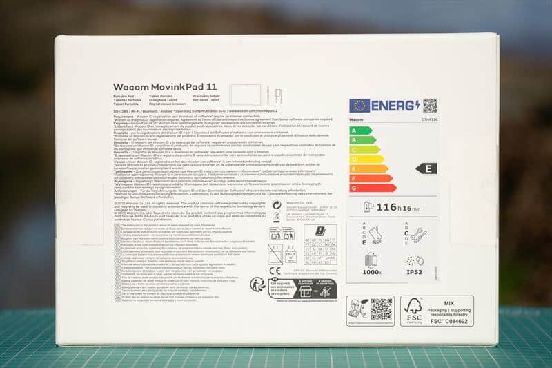 Cam așa se prezintă cutia lui MovinkPad 11. Pe ea găsim rating-ul E pentru impact cu solul. Rating C pe partea de reparabilitate.