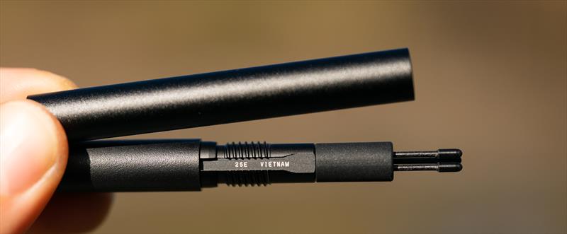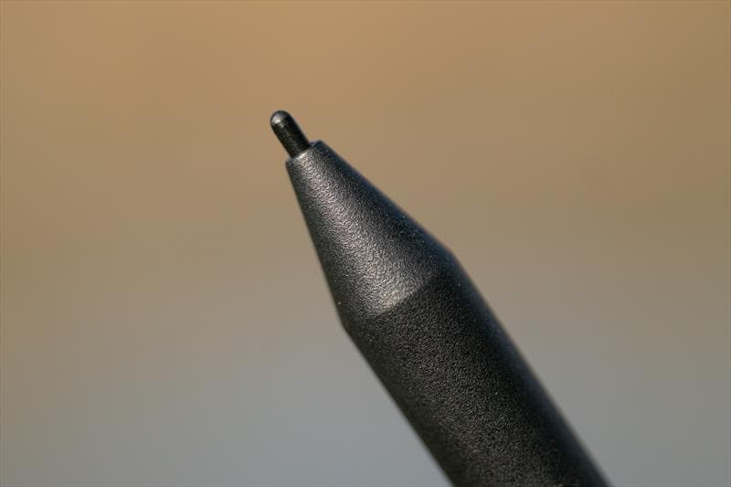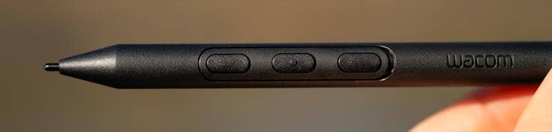 Pe lângă tableta, in cutie găsim Wacom Pro Pen 3 Pro cu 3 butoane fizice si magazie de vârfuri în capăt.